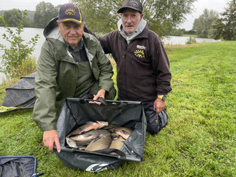 13 septembre 2025, Nous nous rendons, Jean-Jacques et moi, à Margon pou le challenge "Hervé Noiret" en américaine. Jean-Jacques tire le 16 secteur "Jeux" qui n'est jamais péché. Nous décidons de faire 2 coup, un à 39 mètres et un second à 55 mètres. Jean-Jacques utilisera une amorce marron bases Champion Feed Sylver et Lignt pour 39 m et moi une amorce jaune bases Champion Feed Lignt et CdF Brème. La pluie et le vent fort transversal rendront la pêche difficile surtout à 55 m. Les poissons rentreront au bout d'une heure et demi de pêche avec quelques belles brèmes, des plaquettes et de jolis rotengles. Nous termineront ave un poids de 22700, la gagne du secteur et une troisième place au général. Une bonne journée malgré tout et une organisation parfaite de Didier et de son équipe.