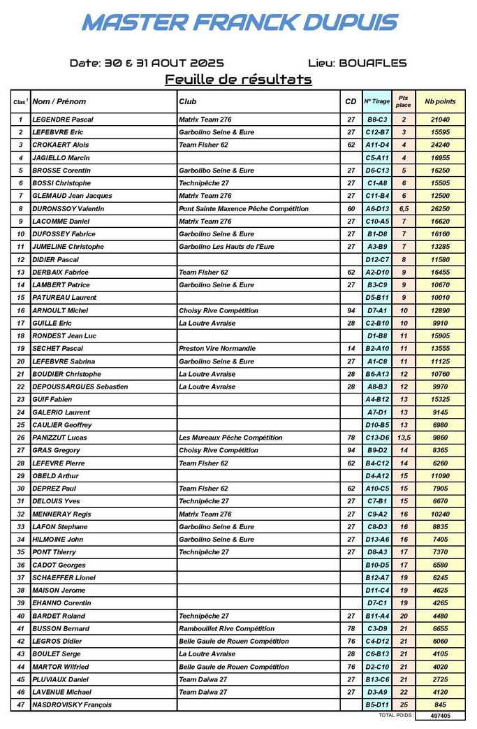 30 & 31 août 2025, Retour sur le Master Franck Dupuis organisé par Romain et toute l'équipe Garbolino Team 276 à Bouafles. 47 participants étaient répartis sur 4 secteurs (Cailloux, Saule et 2 Plages).Le samedi, la première manche a permis de découvrir l'arrivée en masse de petits ides (20 à 50 gr) et de plaquettes. Les grosses brèmes étaient peu présentes. Distances de pêche habituelles. Les ides très présents empêchaient la venue des plaquettes et brèmes. Même chose le dimanche pour la seconde manche. Pascal Legendre sera le seul à gagné ses 2 secteurs et remportera en conséquence le classement général avec 2 points et un total poids de 21 040 devant Eric Lefebvre 3 point et un total de 15595 et Alois Crokaert 4 point et un total de 24240. Près de 500 kilos de poissons auront été pris sur le week-end. Bravo à Romain et toute son équipe pour l'organisation de ce master Franck Dupuis.