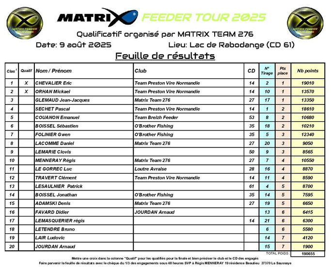 9 et 10 août 2025, Résultat du qualificatif Matrix Feeder Tour 2025 et du concours américaine open organisé par le CD 61 sur le Lac de Rabodanges.