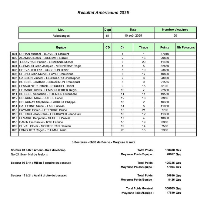 13 septembre 2025, Nous nous rendons, Jean-Jacques et moi, à Margon pou le challenge "Hervé Noiret" en américaine. Jean-Jacques tire le 16 secteur "Jeux" qui n'est jamais péché. Nous décidons de faire 2 coup, un à 39 mètres et un second à 55 mètres. Jean-Jacques utilisera une amorce marron bases Champion Feed Sylver et Lignt pour 39 m et moi une amorce jaune bases Champion Feed Lignt et CdF Brème. La pluie et le vent fort transversal rendront la pêche difficile surtout à 55 m. Les poissons rentreront au bout d'une heure et demi de pêche avec quelques belles brèmes, des plaquettes et de jolis rotengles. Nous termineront ave un poids de 22700, la gagne du secteur et une troisième place au général. Une bonne journée malgré tout et une organisation parfaite de Didier et de son équipe.